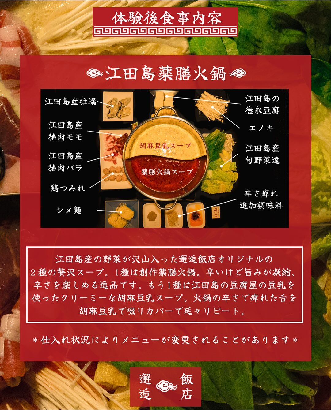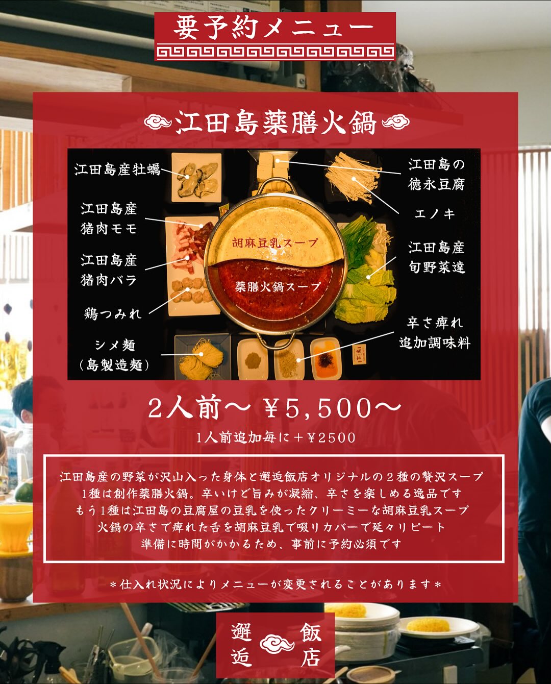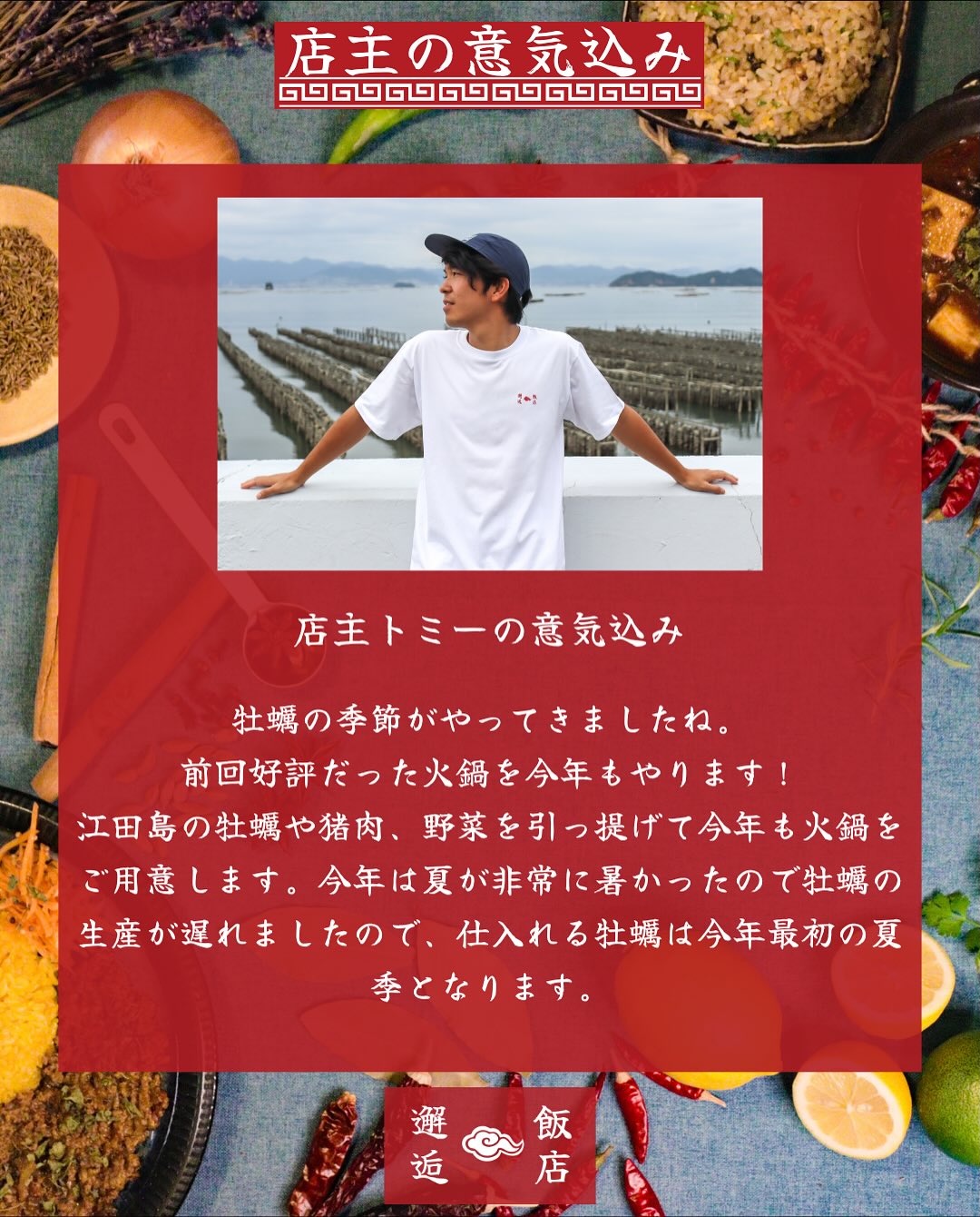 江田島の牡蠣や猪肉、野菜を提げて今年も火鍋をご用意します。今年は夏が非常に暑かったので牡蠣の生産が遅れましたが、ちょうどこのとき仕入れる牡蠣は今年最初の牡蠣となります。是非是非みなさん食べにきてくださいね〜もちろん他の料理も。