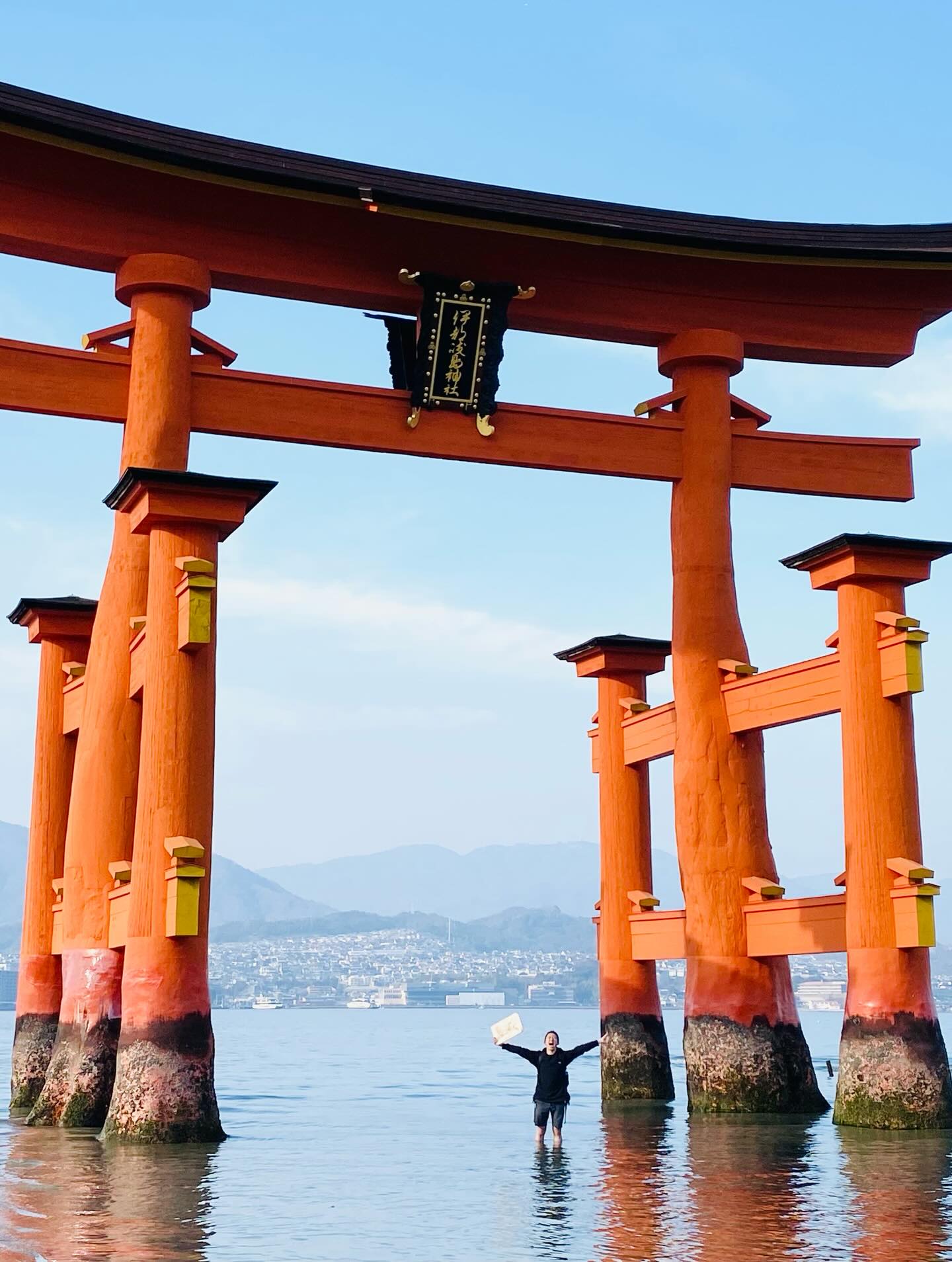 厳島神社に入る前の鳥居で写真を撮ってあげた