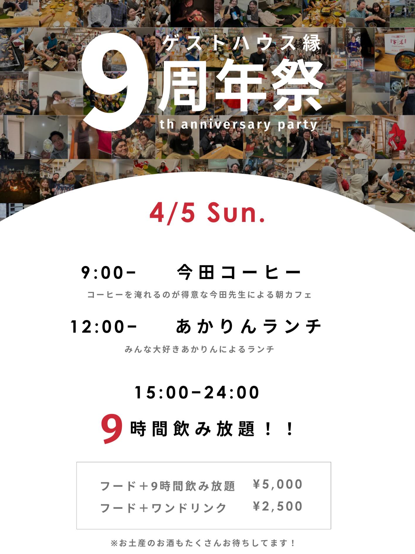 15:00~ ゲストハウス縁9周年祭 15時から24時まで9時間飲み放題