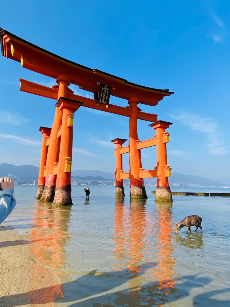 \ 厳島神社大鳥居と鹿とまっすぐ笑っ/